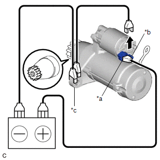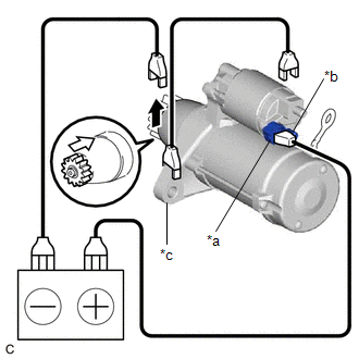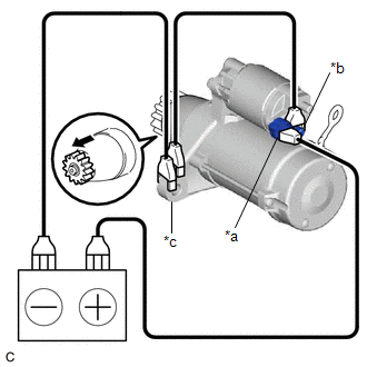 (1) While maintaining the battery connections of the pull-in test, disconnect the negative (-) lead from terminal C. Check that the clutch pinion gear does not return inward.
