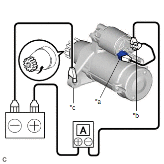 (3) Connect the battery and an ammeter to the starter assembly as shown in the illustration.