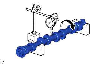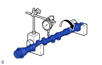 | (a) Inspect the camshaft for runout. (1) Place the camshaft on V-blocks. (2) Using a dial indicator, measure the runout at the center journal. Maximum Runout: 0.03 mm (0.00118 in.) HINT:
