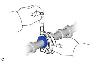 | (a) Inspect the No. 2 camshaft for runout. (1) Place the No. 2 camshaft on V-blocks. (2) Using a dial indicator, measure the runout at the center journal. Maximum Runout: 0.03 mm (0.00118 in.) HINT: