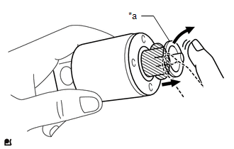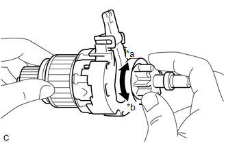 | (b) Hold the starter armature assembly, rotate the clutch pinion gear clockwise, and check that it turns freely. Try to rotate the clutch pinion gear counterclockwise and check that it locks. If the clutch pinion gear does not operate as specified, replace the starter center bearing clutch sub-assembly. |