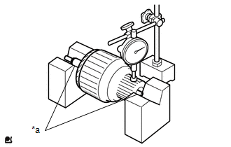 | (d) Check the commutator for runout. (1) Place the armature shaft on V-blocks. (2) Using a dial indicator, measure the runout. Maximum Runout: 0.05 mm (0.00197 in.) If the runout is greater than the maximum, replace the starter armature assembly. |