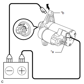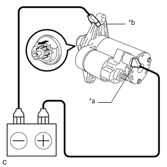(2) Connect the battery and an ammeter to the starter assembly as shown in the illustration.