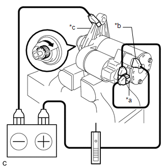 (1) Connect a battery to the magnet starter switch assembly as shown in the illustration. Check that the clutch pinion gear moves outward.