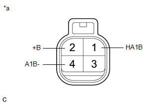 | (a) Measure the resistance according to the value(s) in the table below. Standard Resistance: | Tester Connection | Condition | Specified Condition | | 1 (HA1B) - 2 (+B) | 20°C (68°F) | 2 to 6 Ω | | 1 (HA1B) - 4 (A1B-) | Always | 10 kΩ or higher | If the result is not as specified, replace the air fuel ratio sensor. | | | *a | Component without harness connected (Air Fuel Ratio Sensor) | | |
