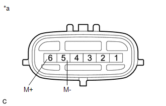 | (a) Measure the resistance according to the value(s) in the table below. Standard Resistance: | Tester Connection | Condition | Specified Condition | | 5 (M-) - 6 (M+) | 20°C (68°F) | 0.3 to 100 Ω | If the result is not as specified, replace the throttle body with motor assembly. | | | *a | Component without harness connected (Throttle Body with Motor Assembly) | | |