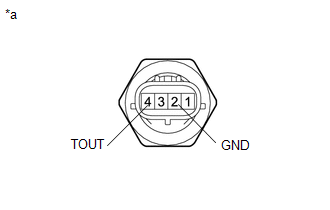 | (2) Measure the voltage between terminals. Standard Voltage: | Tester Connection | Condition | Specified Condition | | 4 (TOUT) - 2 (GND) | 20°C (68°F) | Approximately 1.5 to 2.5 V* | *: The output voltage changes depending on the voltage applied to the terminals. If the result is not as specified, replace the oil pressure and temperature sensor. | | | *a | Component without harness connected (Oil Pressure and Temperature Sensor) | | |