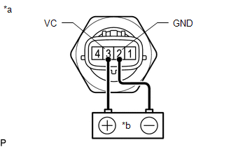 HINT: If a stable power supply is not available, connect 4 nickel-metal hydride batteries (1.2 V each) or equivalent in series. | | | *a | Component without harness connected (Oil Pressure and Temperature Sensor) | | *b | Voltage Applied between Terminals | | |