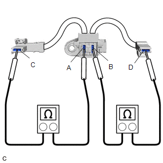 | (a) Measure the resistance according to the value(s) in the table below. Standard Resistance: | Tester Connection | Condition | Specified Condition | | A - C | Always | Below 1 Ω | | B - D | Below 1 Ω | If the result is not as specified, replace the electric vehicle battery plug assembly. | |