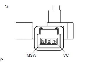 | (b) Measure the resistance according to the value(s) in the table below. Standard Resistance: | Tester Connection | Condition | Specified Condition | | 1 (VC) - 3 (MSW) | Tilt up | 342 to 378 Ω | | Tilt down | 1890.5 to 2089.5 Ω | | Telescopic contract | 750.5 to 829.5 Ω | | Telescopic extend | 152 to 168 Ω | If the result is not as specified, replace the tilt and telescopic switch. | | | *a | Component without harness connected (Tilt and Telescopic Switch) | | |