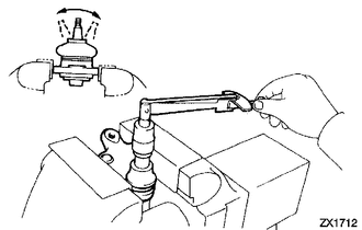 | (a) Inspect the turning torque of the ball joint. (1) Secure the front lower ball joint assembly in a vise using aluminum plates. (2) Install the nut to the front lower ball joint assembly stud. (3) Using a torque wrench, turn the stud continuously at a rate of 3 to 5 seconds per turn and take the torque reading on the 5th turn. Turning Torque: 0.98 to 3.43 N*m (10 to 34 kgf*cm, 9 to 30 in.*lbf) HINT: If the turning torque is not within the specified range, replace the front lower ball joint assembly with a new one. (4) Turn the stud to check that the stud does not catch and there is no play. HINT: If the stud catches or there is play while turning, replace the front lower ball joint assembly with a new one. |