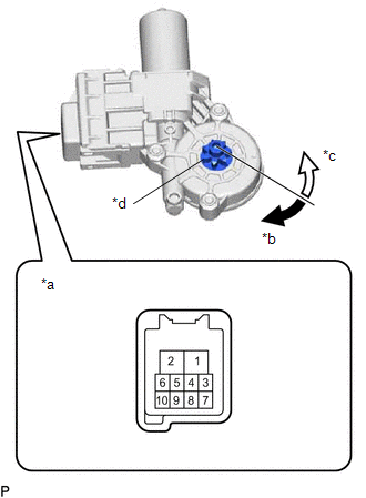 | (a) Connect a positive (+) lead from the auxiliary battery to connector terminal 2. NOTICE: Do not connect a positive (+) lead from the auxiliary battery to any terminal other than terminal 2 to avoid damaging the pulse sensor inside the motor. | | | *a | Component without harness connected (Power Window Regulator Motor Assembly (for Rear RH Door)) | | *b | Clockwise | | *c | Counterclockwise | | *d | Motor gear | | |