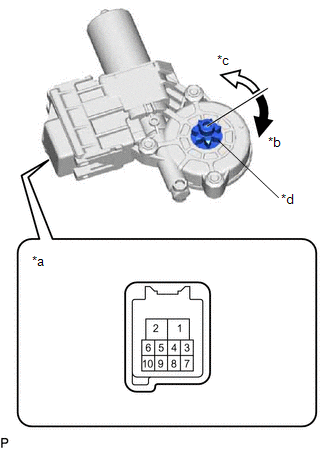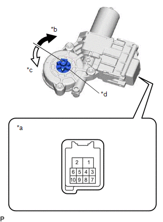 | (a) Connect a positive (+) lead from the auxiliary battery to connector terminal 2. NOTICE: Do not connect a positive (+) lead from the auxiliary battery to any terminal other than terminal 2 to avoid damaging the pulse sensor inside the motor. | | | *a | Component without harness connected (Power Window Regulator Motor Assembly (for Front Passenger Door)) | | *b | Clockwise | | *c | Counterclockwise | | *d | Motor gear | | |