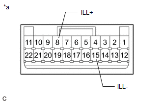 | (1) Apply auxiliary battery voltage to the panoramic view monitor switch (No. 2 combination switch assembly) and check that the switch illumination illuminates. OK: | Connection | Specified Condition | | Auxiliary battery positive (+) → Terminal 8 (ILL+) Auxiliary battery negative (-) → Terminal 15 (ILL-) | Illuminates | If the result is not as specified, replace the panoramic view monitor switch (No. 2 combination switch assembly). | | | *a | Component without harness connected (Panoramic View Monitor Switch (No. 2 Combination Switch Assembly)) | | |