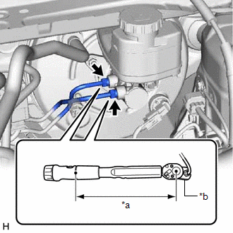 | (b) Using a union nut wrench, connect the 2 brake lines to the brake master cylinder sub-assembly. Torque: Specified tightening torque : 19.5 N·m {199 kgf·cm, 14 ft·lbf} NOTICE: -