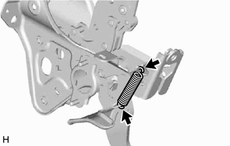| (a) Install the brake pedal return spring to the brake pedal support assembly. NOTICE: Attach the bottom part of the brake pedal return spring first, making sure that the open part of the hook is facing the front of the vehicle. Attach the top part of the brake pedal return spring second, making sure that the open part of the hook is facing the rear of the vehicle. |