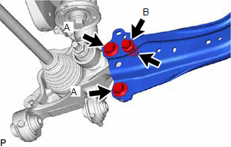 | (c) Install the rear trailing arm assembly to the rear axle carrier sub-assembly with the 3 bolts and nut. Torque: Bolt A : 135 N·m {1377 kgf·cm, 100 ft·lbf} Bolt B : 75 N·m {765 kgf·cm, 55 ft·lbf} |