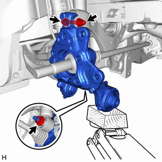 | (a) Temporarily install the rear axle carrier sub-assembly to the rear shock absorber assembly with the nut and plate washer. NOTICE: Hold the rear axle carrier pin while rotating the nut. |