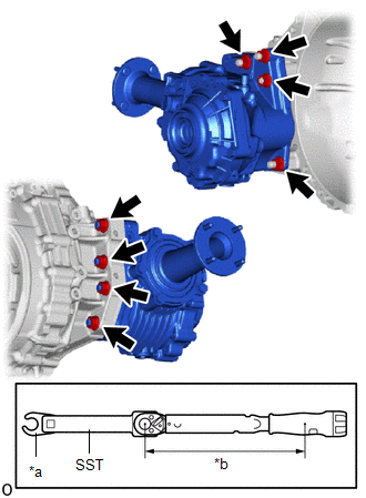 | (a) Using SST and a 17 mm union nut wrench, install the transfer assembly to the automatic transaxle assembly with the 8 nuts. SST: 09961-00950 Torque: Specified tightening torque : 68.6 N·m {700 kgf·cm, 51 ft·lbf} HINT: -