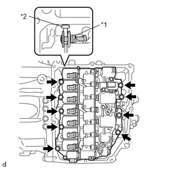 | (e) Align the slit portion of the manual valve and the manual valve lever sub-assembly as shown in the illustration, and install the transmission valve body assembly to the automatic transaxle case sub-assembly with the 9 bolts. Torque: 10.8 N·m {110 kgf·cm, 8 ft·lbf} NOTICE: Be careful that the transmission revolution sensor (NC) wire is not pinched. |