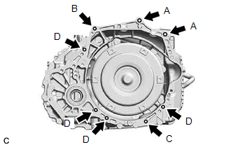 | (c) While keeping the engine assembly and automatic transaxle assembly horizontal, align the knock pins with the holes in the automatic transaxle assembly and install the automatic transaxle assembly with the 8 bolts shown in the illustration. Torque: Bolt (A) : 64 N·m {653 kgf·cm, 47 ft·lbf} Bolt (B) : 46 N·m {469 kgf·cm, 34 ft·lbf} Bolt (C) : 25 N·m {255 kgf·cm, 18 ft·lbf} Bolt (D) : 46 N·m {469 kgf·cm, 34 ft·lbf} Bolt Length:
