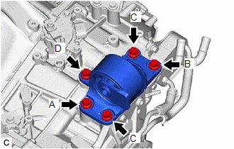 | (a) Install the rear No. 2 engine mounting insulator to the automatic transaxle case sub-assembly with the 5 bolts. Torque: 42 N·m {428 kgf·cm, 31 ft·lbf} HINT: Tightening order: Temporarily tighten bolt (A) → Fully tighten bolt (B) → Fully tighten bolt (C) → Fully tighten bolt (A) → Fully tighten bolt (D) |