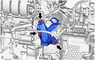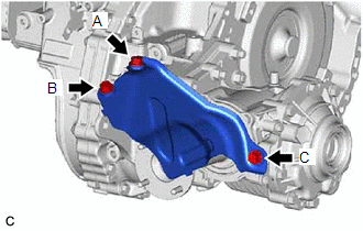 | (a) Install the front engine mounting bracket to the transaxle housing with the 3 bolts. Torque: 42 N·m {428 kgf·cm, 31 ft·lbf} HINT: Tightening order: Temporarily tighten bolt (A) → Fully tighten bolt (B) → Fully tighten bolt (C) → Fully tighten bolt (A) |
