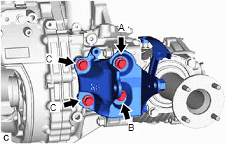 | (a) Install the rear engine mounting bracket sub-assembly to the transaxle housing with the 4 bolts. Torque: 42 N·m {428 kgf·cm, 31 ft·lbf} HINT: Tightening order: Temporarily tighten bolt (A) → Fully tighten bolt (B) → Fully tighten bolt (A) → Fully tighten bolt (C) |
