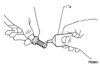 | (b) Apply a few drops of adhesive to 2 or 3 threads at the tip of each of the 6 drive plate and torque converter assembly setting bolts. Adhesive: Toyota Genuine Adhesive 1324, Three Bond 1324 or equivalent NOTICE: Make sure to install the 6 drive plate and torque converter assembly setting bolts immediately after applying adhesive to prevent foreign matter from attaching to them. |