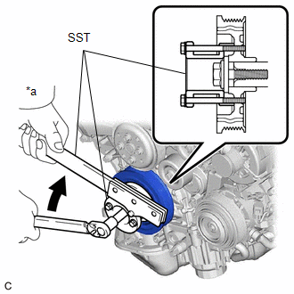 (b) Using SST to hold the crankshaft pulley in place, tighten the crankshaft pulley set bolt.