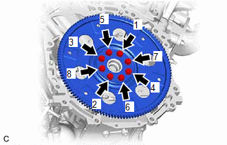 | (e) Install and uniformly tighten the 8 bolts in several steps in the sequence shown in the illustration. Torque: 83 N·m {846 kgf·cm, 61 ft·lbf} NOTICE: Do not start the engine for at least 1 hour after installing the drive plate and ring gear sub-assembly. |