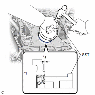 (c) Using SST and a hammer, tap in the rear engine oil seal.