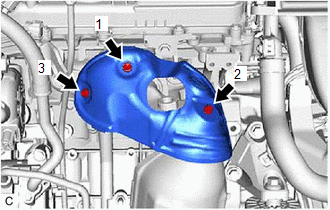 | (a) Install the No. 1 exhaust manifold heat insulator to the exhaust manifold assembly RH (TWC: Front Catalyst) with the 3 bolts in the order shown in the illustration. Torque: 8.5 N·m {87 kgf·cm, 75 in·lbf} |