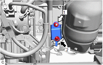 (b) Temporarily install the No. 2 manifold stay to the exhaust manifold assembly LH (TWC: Front Catalyst) and cylinder block sub-assembly with the bolt and nut.