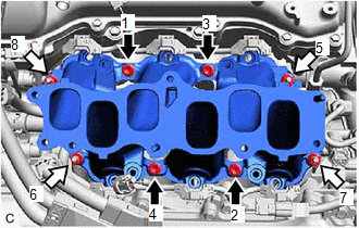 (a) Temporarily install the intake manifold to the cylinder head sub-assembly with the 4 bolts and 4 nuts.