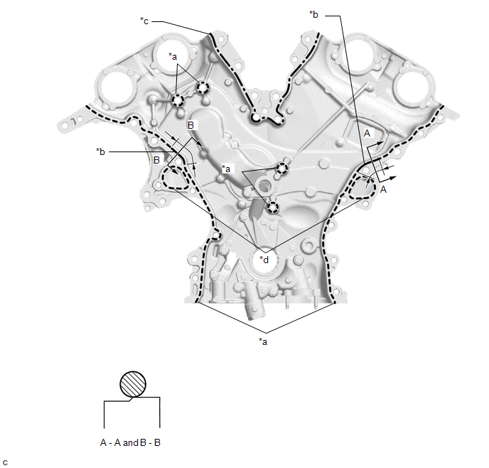 | *c | Alternate Long and Short Dashed Line Area (Seal packing: Toyota Genuine Seal Packing Black, Three Bond 1207B or equivalent) | *d | Dashed Line Area (Seal packing: Toyota Genuine Seal Packing 1282B, Three Bond 1282B or equivalent) |
