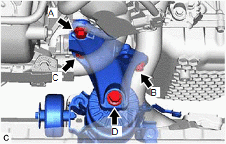 | (c) Install the front engine mounting bracket to the transaxle housing with the 3 bolts. Torque: Bolt (A), (B) and (C) : 42 N·m {428 kgf·cm, 31 ft·lbf} NOTICE: Temporarily tighten the bolt (A), and then fully tighten the 3 bolts in the order of (B), (C) and (A). |