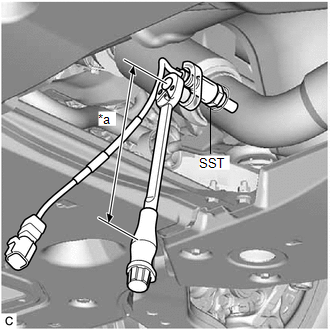 | (a) Using SST, install the air fuel ratio sensor to the front exhaust pipe assembly (TWC: Rear Catalyst). SST: 09224-00012 Torque: Specified tightening torque : 44 N·m {449 kgf·cm, 32 ft·lbf} NOTICE: If the air fuel ratio sensor has been struck or dropped, replace it. | | | *a | Torque Wrench Fulcrum Length | | |
