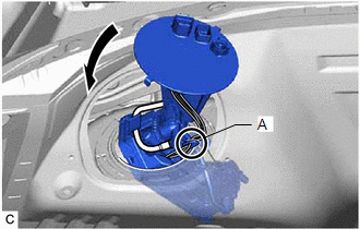 | (d) Set the part (A) of the fuel suction tube with pump and gauge assembly against the fuel tank assembly, and install the fuel suction tube with pump and gauge assembly to the fuel tank assembly as shown in the illustration. NOTICE: Be careful not to bend the arm of the fuel sender gauge assembly. |