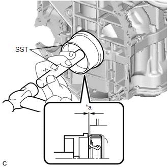 | (c) Using SST and a hammer, tap in the rear engine oil seal. SST: 09223-15030 SST: 09950-70010 09951-07150 Standard Depth: -0.9 to 1.1 mm (-0.0354 to 0.0433 in.) (From the edge of the cylinder block sub-assembly and stiffening crankcase assembly) NOTICE: Do not tap in the rear engine oil seal at an angle. |