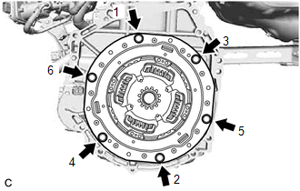 | (b) Install the transmission input damper assembly to the flywheel sub-assembly with the 6 bolts. Uniformly tighten the 6 bolts in the order shown in the illustration. Torque: 30 N·m {306 kgf·cm, 22 ft·lbf} NOTICE: