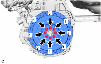 | (d) Install the flywheel sub-assembly with the 8 bolts. Uniformly tighten the 8 bolts in the sequence shown in the illustration. Torque: 150 N·m {1530 kgf·cm, 111 ft·lbf} NOTICE: Do not start the engine for at least 1 hour after installing the flywheel sub-assembly. |