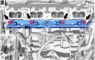 | (d) Install the fuel delivery pipe by uniformly tightening the 4 bolts in the order shown in the illustration. Torque: 28.5 N·m {291 kgf·cm, 21 ft·lbf} |