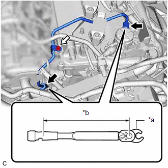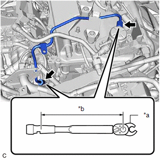 | (1) Using a 17 mm union nut wrench, tighten the union nut on the fuel delivery pipe side of the No. 1 fuel pipe sub-assembly. Torque: Specified tightening torque : 35 N·m {357 kgf·cm, 26 ft·lbf} NOTICE: Do not adjust the torque in the loosening direction. HINT: