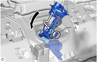 | (c) Set the part (A) of the fuel suction tube with pump and gauge assembly against the fuel tank assembly, and install the fuel suction tube with pump and gauge assembly to the fuel tank assembly as shown in the illustration. NOTICE: Be careful not to bend the arm of the fuel sender gauge assembly. |