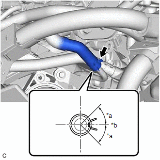 | (e) Connect the No. 8 water by-pass hose to the No. 2 water by-pass pipe and slide the clip to secure it. HINT: Engage the clip within the area shown in the illustration. |