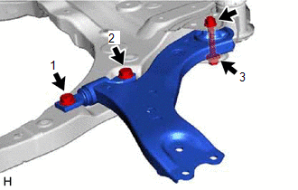 | (b) Install the front lower No. 1 suspension arm sub-assembly LH to the front frame assembly with the 3 bolts and nut in the order shown in the illustration. Torque: Bolt (1), (2) : 200 N·m {2039 kgf·cm, 148 ft·lbf} Bolt (3) : 135 N·m {1377 kgf·cm, 100 ft·lbf} NOTICE: Because the nut has its own stopper, do not turn the nut. Tighten the bolt with the nut secured. |