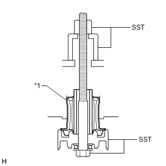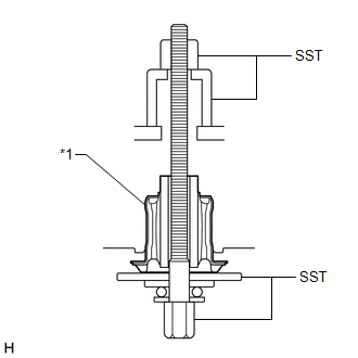 | (b) Install SST as shown in the illustration. SST: 09570-24011 SST: 09830-10010 09830-01010 09830-01020 09830-01040 09830-01060 NOTICE: Apply molybdenum grease to the threads and tip of the SST center bolt before use. |