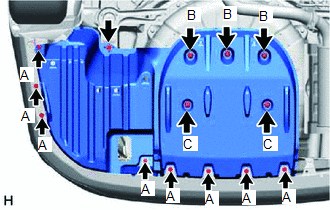 | (a) Install the rear floor side member cover with the 3 grommets (B) and 2 clips (C). | |