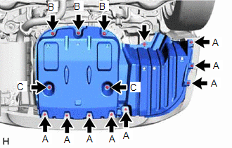 | (a) Install the rear floor side member cover with the 3 grommets (B) and 2 clips (C). |